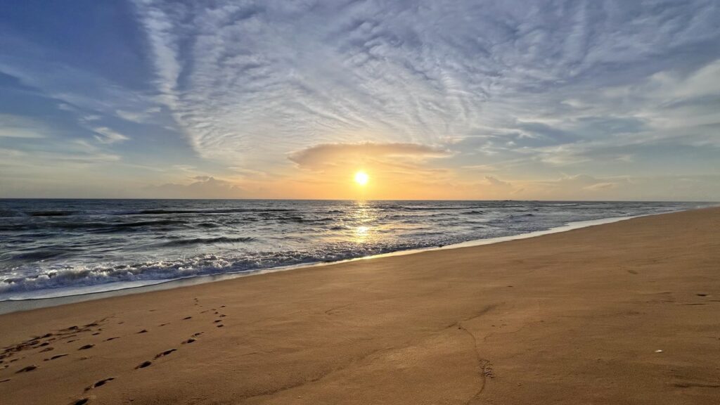 • Закат на пляже — огненно-золотое небо и море в тишине.