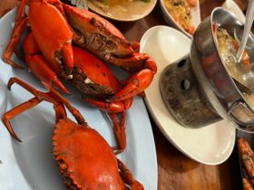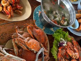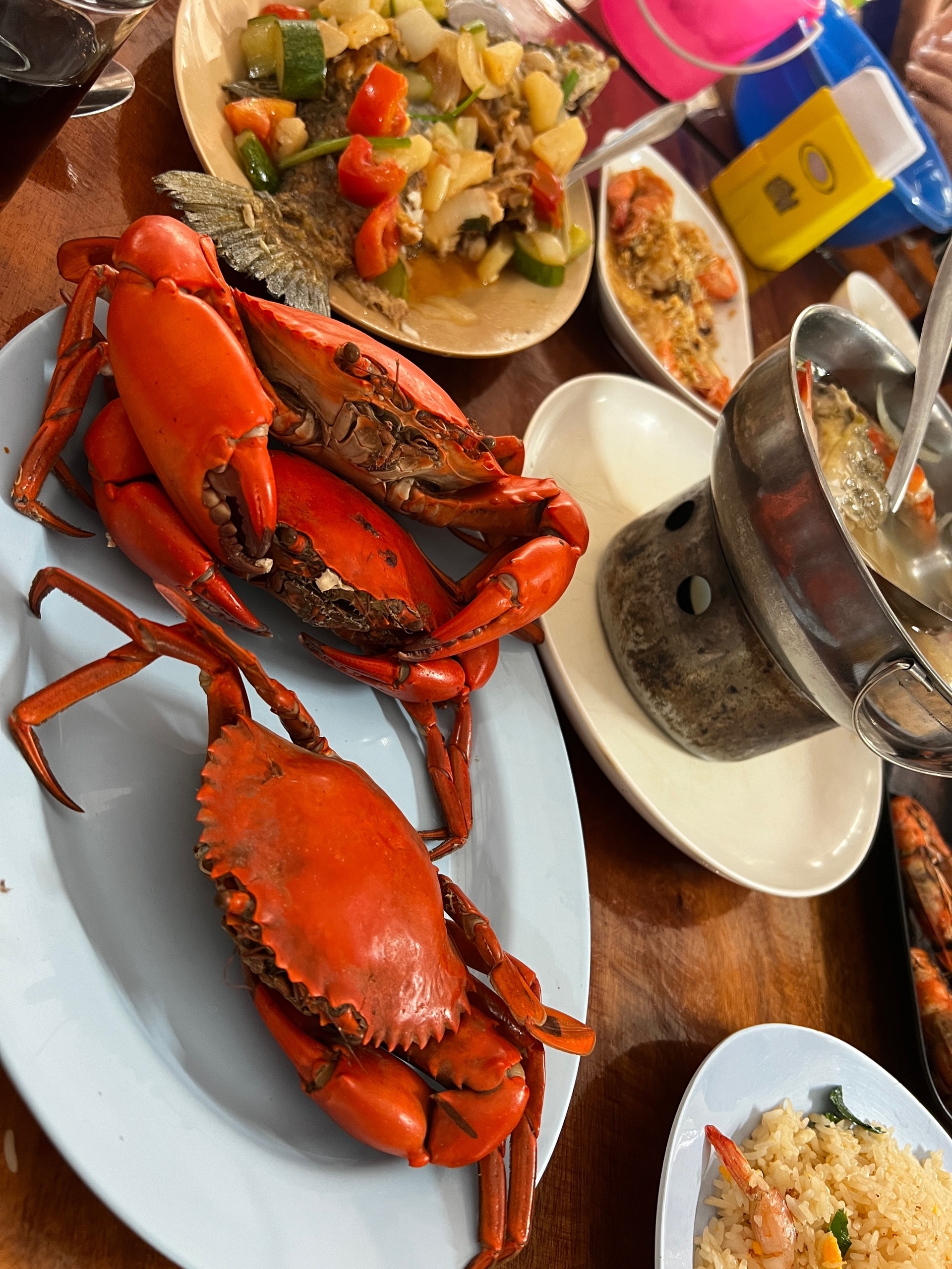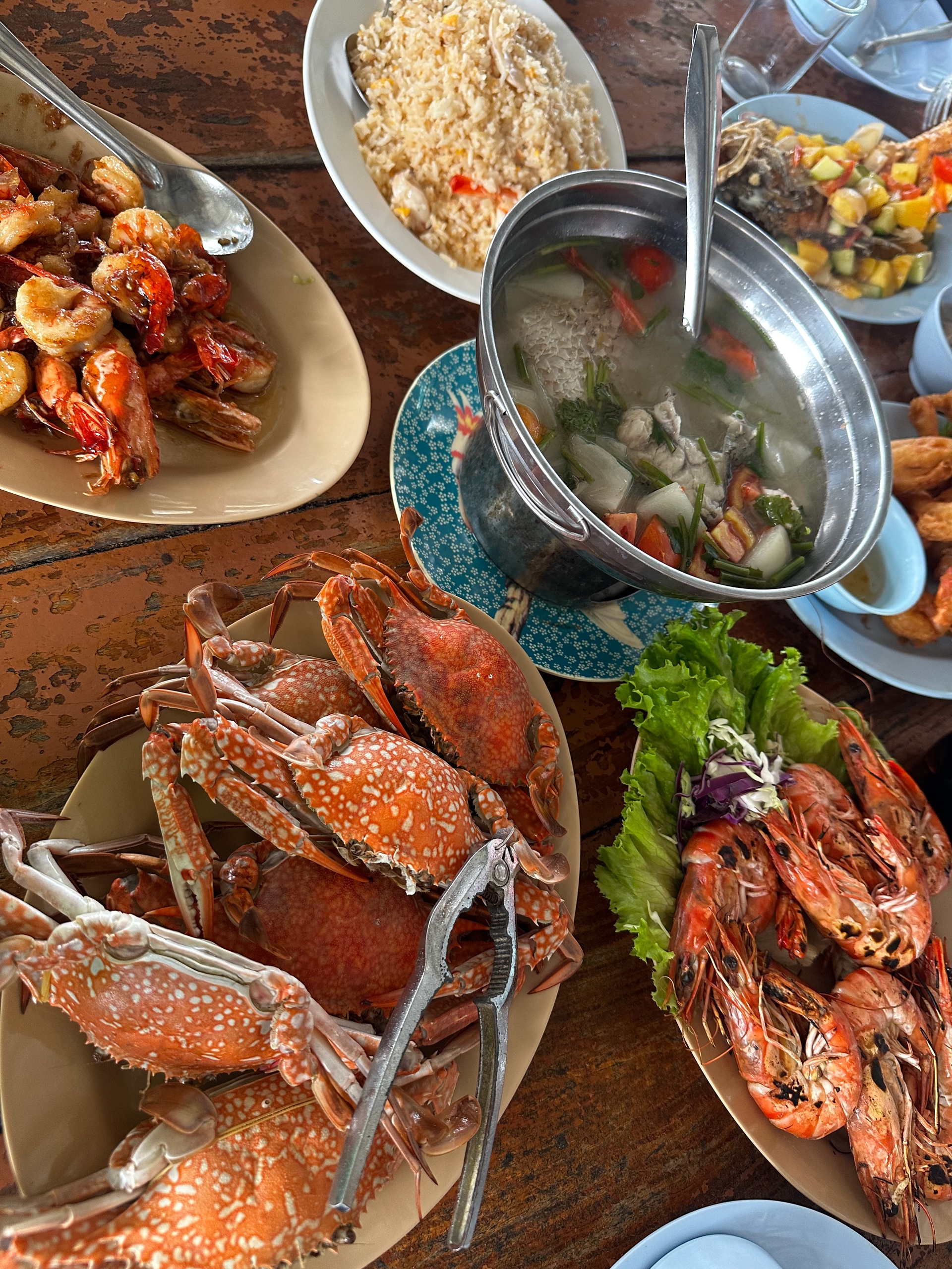 Гастрономическое наслаждение: обед из свежих морепродуктов в деревне (краб, креветки, рыба, кальмары).